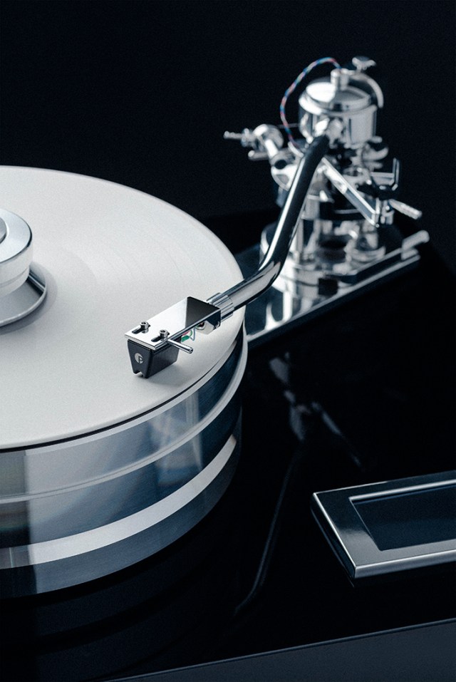 This high-end tonearm features a non-magnetic low resonance construction with minimised bearing friction.