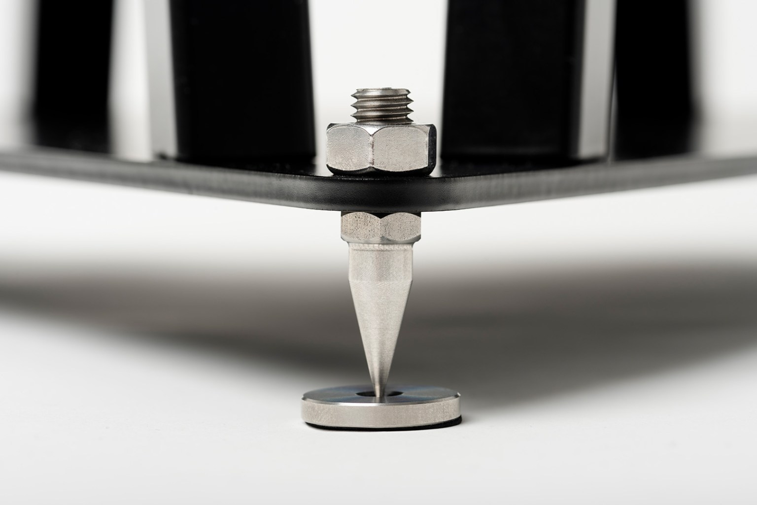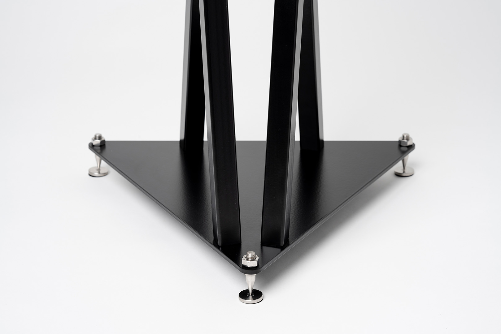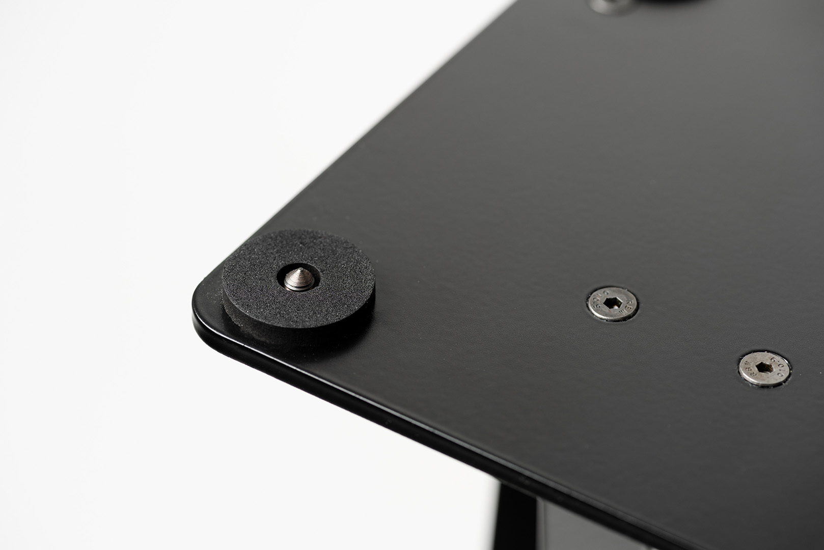 We also offer you spikes on the top plate to place your speaker on it. Spikes are designed to reduce the contact area to minimize the vibration interference, which allows speaker vibration to be diverted through the stand into the floor. By minimizing these vibrations, the bass response becomes cleaner and feels more controlled. It will also help to bring fine details to light, which furthermore improves the stereo image. If you don‘t want to place your speakers onto the spikes, we also offer microporous rubber pads as an alternative.